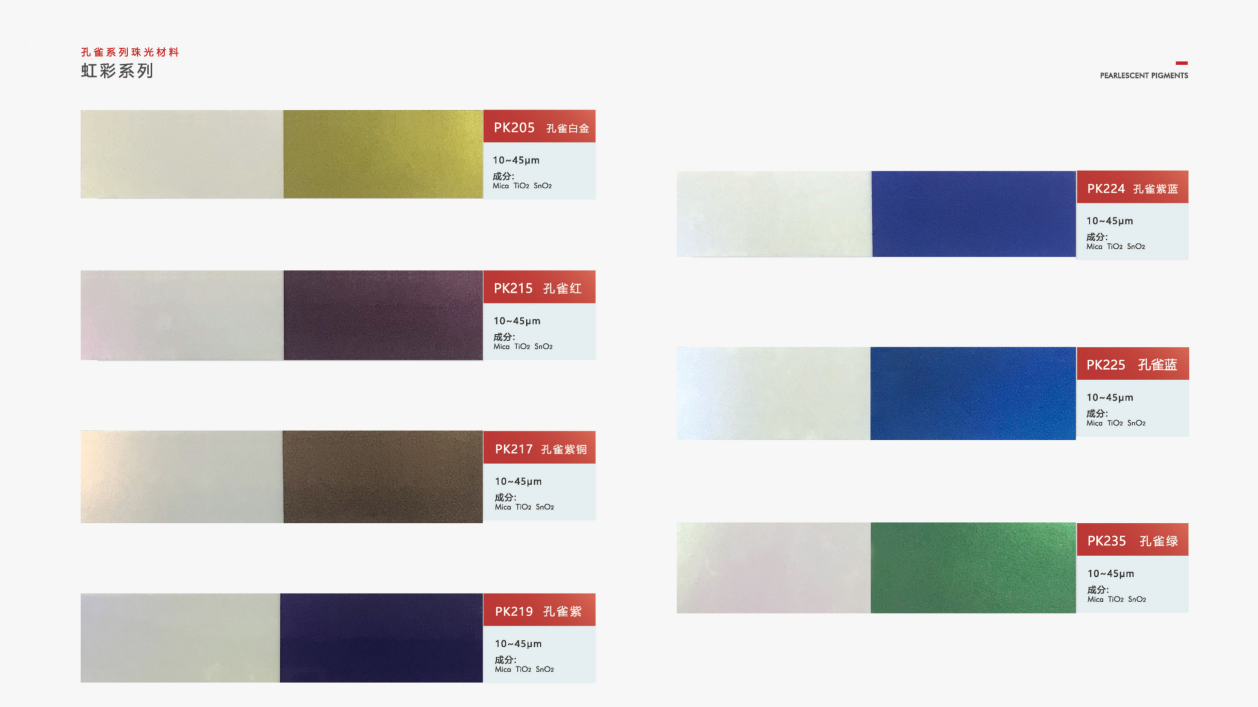 该系列珠光颜料特有的工艺技术造就优质的天然云母基材色系丰富,色彩更加明艳,优良的纯净度保证了宽泛的应用领域。