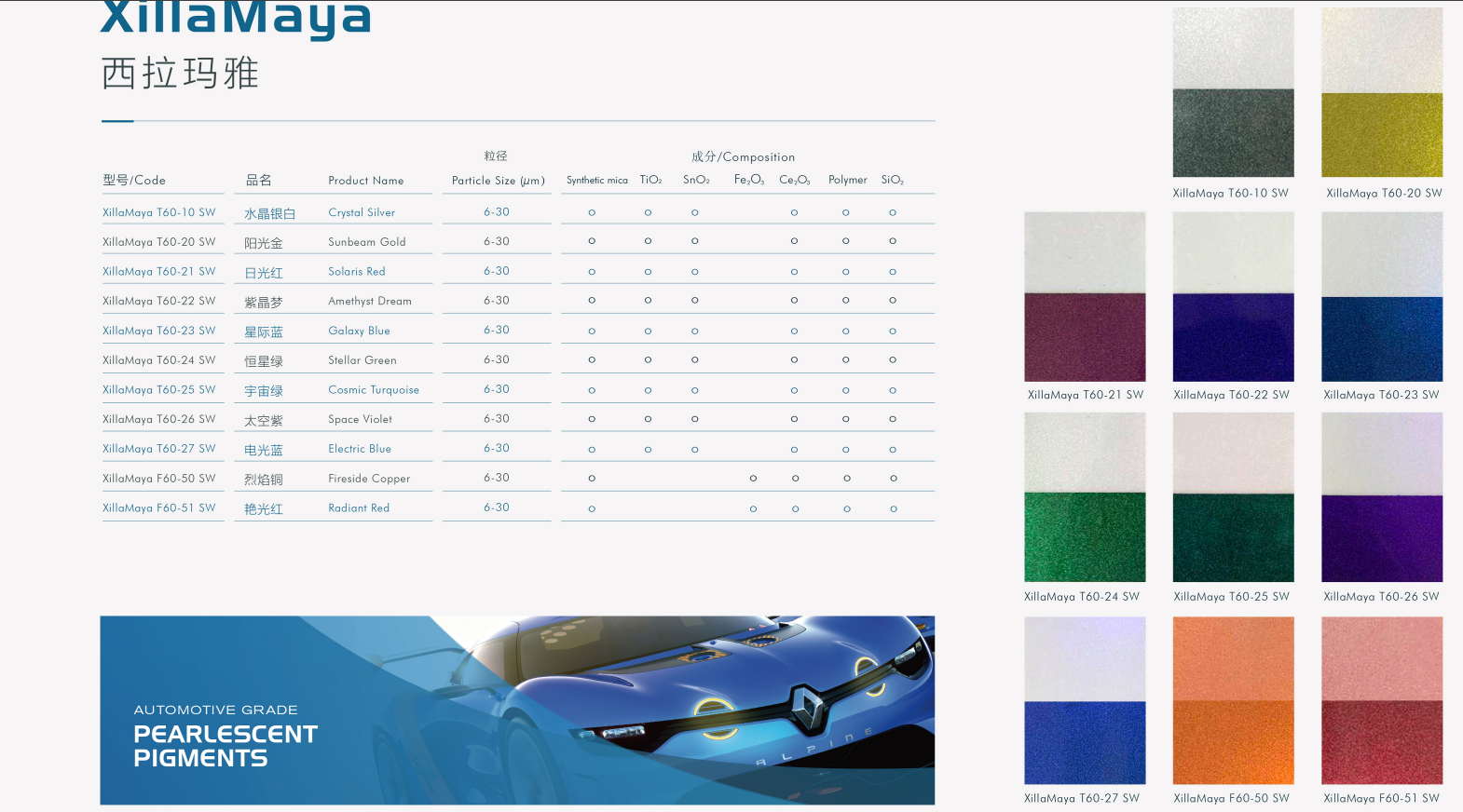 在全球范围内,高端汽车涂料不再止于功能性的革新,原厂漆、修补漆,涂料制造商在不断提高产品质量和性能的同时,也有了一双全新的对色彩敏锐的双眼,他们斥巨资对色彩流行趋势做研判,在没有规则的色彩世界中,捕捉不一样的色彩元素。西拉玛雅系列珠光材料,凭借着超高色彩饱和度、超高闪烁光感、卓越的耐候性能,所展现的无条件的美,助力于汽车涂料制造商。
